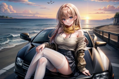(best quarity:1.5), high resolution, (extremely detailed), ultra high res, 8K, masterpiece, (perfect anatomy), (1 girl), 20 years old, large breast, adult, sexy, orange hair, long hair, (open breast pink sweater:1.6, beige pantyhose:1.6, yellow scarf), (sitting on car, legs on handle, evil smile), (slope, sea side road, flock of birds), white skin, (super fine illustration), <lora:hairdetailer:0.8>