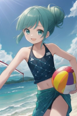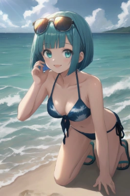 masterpiece, best quality, highres, 1girl, Tank Top, jeans, sneakers, sunglasses on head, かわいい, medium breasts, marine blue hair, aqua eyes, asymmetrical hair, bob cut, smile, 18 yo, nice hands, perfect hands, Crystal Clear Sea, view from hill, Parking lot, model posing<lora:flat2:0> <lora:hairdetailer:0.5><lora:GoodHands-vanilla:1>
