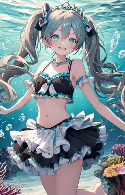 masterpiece, best quality, extremely detailed, anime, girlmasterpiece, best quality, extremely detailed, anime, girl, masterpiece, best quality, extremely detailed, anime, girl, skirtmasterpiece, best quality, extremely detailed, anime, girl, 1girl, hatsune miku, vocaloid,Anime illustration: Set against the expansive blue of the coral reef cave, a high girl with a high is swimming. Her black and white metallic bikini, adorned with a floral pattern and frills, stands out. Bubbles and the dance of light refractions enrich the scene.,longhair,tail,Witch,al girl,whale,sea,Princess,Twintails,mini skirt,fantasy,masterpiece, best quality, extremely detailed, anime, girl, skirt1girl, hatsune miku, vocaloid, masterpiece, best quality, extremely detailed, anime, girl, skirtmasterpiece, best quality, extremely detailed, anime, girl, skirt(hatsune miku:1.1)(1girl,solo,loli:1.2), (masterpiece:1.3),(best quality:1.3), white Clothes,frilled bikini, bikini skirt, an extremely delie and beautiful,smile,(arms up:0.5),ry , at ,Side Tail,fantasy,longhair,mini skirt,Twintails,Rubber,blue ,clear ,sea,twintail,blue eyes,Crystal Clear Sea,Footprints skirt