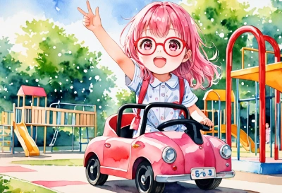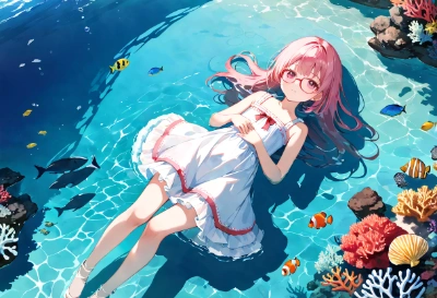 masterpiece, best quality, extremely detailed, absurdres, highres, watercolor art style , an girl , 5yo, kawaii, pink hair, pink eyes, diving, (underwater goggles:1.2], glasses, wetsuit, (oxygen tank on back , air tube connecting mouthpiece , mouthpiece in mouth,), diving, underwater, various fish, sea turtle