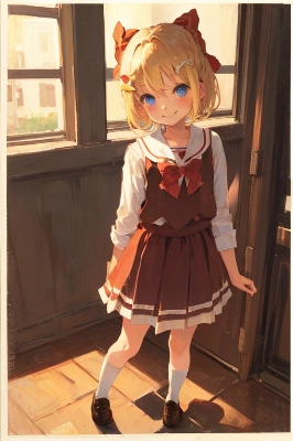 1girl,solo,short hair,blonde hair,blue eyes,red ribbon,(hair bow:1.3),red bow,black one-piece swimsuit,school swimsuit,swimming,pool,determined expression,focused expression,swimming action,detailed background,anime style,japanese anime style,young girl,athletic,water splashes,dynamic pose,competitive swimming,indoors,clear water,swimming lanes,ripples,sunlight reflecting on water,strong strokes,freestyle swimming,swimming goggles on head,streamlined,powerful movement,training,sports,energetic,serious,