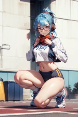 the girl with a basketball and drink sitting on the court at the court, basketball, 1girl, solo, water bottle, shoes, shorts, sneakers, bottle, sitting, ponytail, shirt, basketball uniform, sportswear, black shorts, more_details:1.5,,glasses, thick eyebrows, short eyebrows, droopy eyes, headphones, scarf, blue hair, side ponytail, smile, gigantic breast,