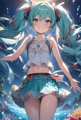 masterpiece, best quality, extremely detailed, anime, girl, skirt1girl, hatsune miku, vocaloid, masterpiece, best quality, rating: general, newest,mini skirt,blue hair,green hair,twintail,longhair,wet hair,blue eyes,Sports,Short Stature,fairy,fantasy,butterfly,forest,full moon,night,flower