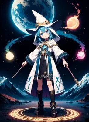 fantasy motif outfit, dwarf outfit, mage robe, wizard hat, planet motif wizard wand,