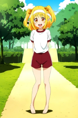 One girl, two side up, blonde hair, short hair, orange bobbles, elf ears, orange eyes, gym uniform, gym shorts, red shorts, high-waisted shorts, flat chest, white headband, nsfw, standing, anime coloring, barefoot, full body, outdoor, school yard, best quality, amazing quality, very aesthetic, absurdres