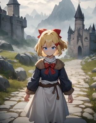 1girl,solo,short hair,blonde hair,blue eyes,red ribbon,hair ornament,(hair bow:1.3),red bow,reminiscing,sepia-toned amusement park,nostalgic expression,detailed background,anime style,japanese anime style,young girl,memory,past,vintage,amusement park,ferris wheel,carousel,old-fashioned rides,childhood memories,wistful,dreamy,emotional,soft focus,gentle lighting,retro,faded colors,poignant,reflective,sentimental,playground,quiet moment,peaceful,introspective,dreamy atmosphere,melancholic,