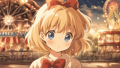 1girl,solo,short hair,blonde hair,blue eyes,red ribbon,(hair bow:1.3),red bow,,holding photo,old photo,sepia photo,nostalgic expression,thoughtful expression,detailed background,anime style,japanese anime style,young girl,vintage,indoors,room,soft lighting,antique furniture,photo of grandmother,family resemblance,sentimental,memory,reminiscent,contemplative,looking at photo,sitting,calm,warm colors,vintage room,historical,emotional,peaceful,introspective,