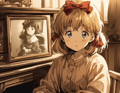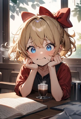1girl,1boy,short hair,blonde hair,blue eyes,red ribbon,(hair bow:1.2),red bow,loli,small girl,tall boy,girl looking up,boy looking down,contrasting heights,hopeful expression,detailed background,anime style,japanese anime style,young girl,young boy,indoors,casual clothing,simple room,wooden floor,sunlight,standing together,cute interaction,height difference,playful,innocent,everyday scene,smiling boy,wistful girl,friendship,sibling-like,soft lighting,summer clothing,gentle atmosphere,