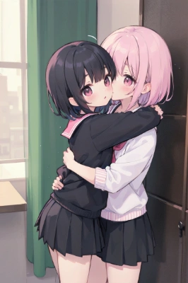masterpiece, best quality, extremely detailed, anime, girl, skirt, kissing, hug, student, twin, black eyes, pink eyes, pink hair, black hair, bobcut, girl,, kissing, hug, night, student, twin, black eyes, pink eyes, pink hair, black hair, long sleeve, bobcut, girl,