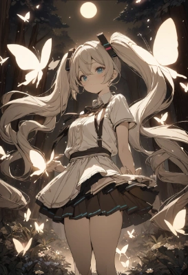 masterpiece, best quality, extremely detailed, anime, girl, skirtmasterpiece, best quality, extremely detailed, anime, girl, 1girl, hatsune miku, vocaloid,Twintails,Princess,longhair,princess,butterfly,flower,castle,fantasy,night,moon,full moon,starry sky,night sky,sea,Sepia,twintail