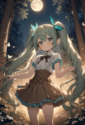 masterpiece, best quality, extremely detailed, anime, girl, skirtmasterpiece, best quality, extremely detailed, anime, girl, 1girl, hatsune miku, vocaloid,Twintails,Princess,longhair,butterfly,fantasy,ry , ,Sepia,twintail,forest,flower,night,full moon,starry sky