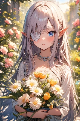spring,cute 1girl,12yo,(platinum hair),(long straight hair:1.5),elf ear,smooth body,sharp face,small breasts,fashionable,trendy outfit,(Flower-shaped eye patch:1.3),