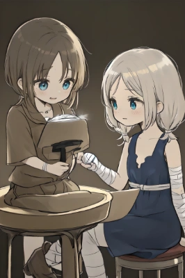 (sepia, ((sepia color, sepia photography)), perfect anatomical body), front view shot from above, spotlighted, one girl, solo, looking down, ((silver hair, short hair, pigtails, very long sideburns, parted bangs, ribbon headdress, red)), pretty face, eyes closed, mouth smiling, small chest, short height, (wearing red boxer shorts), red ring boots, (sitting on a stool, head bowed and back hunched), tired, (fists pointing down, elbows resting on knees), (white bandages wrapped around, old, fists), (kitten next to her), (realistic background, ringside background, blur background, dark background depth), audience looking from the front, <lora:flat2:0.6> <lora:hairdetailer:0.4> ,,