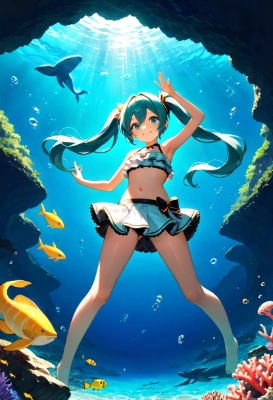 masterpiece, best quality, extremely detailed, anime, girl, skirtmasterpiece, best quality, extremely detailed, anime, girl, masterpiece, best quality, extremely detailed, anime, girl, skirtmasterpiece, best quality, extremely detailed, anime, girl, 1girl, hatsune miku, vocaloid,Anime illustration: Set against the expansive blue of the coral reef cave, a high girl with a high is swimming. Her black and white metallic bikini, adorned with a floral pattern and frills, stands out. Bubbles and the dance of light refractions enrich the scene.,longhair,tail,Witch,al girl,whale,sea,Princess,Twintails,mini skirt,fantasy,masterpiece, best quality, extremely detailed, anime, girl, skirt1girl, hatsune miku, vocaloid, masterpiece, best quality, extremely detailed, anime, girl, skirtmasterpiece, best quality, extremely detailed, anime, girl, skirt(hatsune miku:1.1)(1girl,solo,loli:1.2), (masterpiece:1.3),(best quality:1.3), white Clothes,frilled bikini, bikini skirt, an extremely delie and beautiful,smile,(arms up:0.5),ry , at ,Side Tail,fantasy,longhair,mini skirt,Twintails,Rubber,blue ,clear ,sea,twintail,blue eyes,Crystal Clear Sea,Footprints,Short Stature,Stars,dragon,different world,starry sky