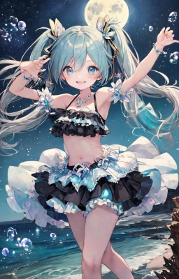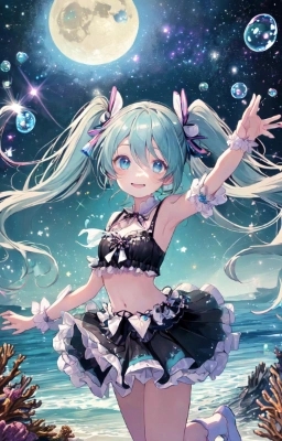 masterpiece, best quality, extremely detailed, anime, girl, skirtmasterpiece, best quality, extremely detailed, anime, girl, masterpiece, best quality, extremely detailed, anime, girl, skirtmasterpiece, best quality, extremely detailed, anime, girl, 1girl, hatsune miku, vocaloid,Anime illustration: Set against the expansive blue of the coral reef cave, a high girl with a high is swimming. Her black and white metallic bikini, adorned with a floral pattern and frills, stands out. Bubbles and the dance of light refractions enrich the scene.,longhair,tail,Witch,al girl,whale,Princess,Twintails,mini skirt,fantasy,masterpiece, best quality, extremely detailed, anime, girl, skirt1girl, hatsune miku, vocaloid, masterpiece, best quality, extremely detailed, anime, girl, skirtmasterpiece, best quality, extremely detailed, anime, girl, skirt(hatsune miku:1.1)(1girl,solo,loli:1.2), (masterpiece:1.3),(best quality:1.3), white Clothes,frilled bikini, bikini skirt, an extremely delie and beautiful,smile,(arms up:0.5),ry , at ,Side Tail,fantasy,longhair,mini skirt,Twintails,Rubber,blue ,clear ,twintail,blue eyes,Crystal Clear Sea,Footprints,Short Stature,Stars,fairy,princess,night,full moon,flower,starry sky,space,sea,castle
