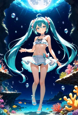 masterpiece, best quality, extremely detailed, anime, girl, skirtmasterpiece, best quality, extremely detailed, anime, girl, masterpiece, best quality, extremely detailed, anime, girl, skirtmasterpiece, best quality, extremely detailed, anime, girl, 1girl, hatsune miku, vocaloid,Anime illustration: Set against the expansive blue of the coral reef cave, a high girl with a high is swimming. Her black and white metallic bikini, adorned with a floral pattern and frills, stands out. Bubbles and the dance of light refractions enrich the scene.,longhair,tail,Witch,al girl,whale,Princess,Twintails,mini skirt,fantasy,masterpiece, best quality, extremely detailed, anime, girl, skirt1girl, hatsune miku, vocaloid, masterpiece, best quality, extremely detailed, anime, girl, skirtmasterpiece, best quality, extremely detailed, anime, girl, skirt(hatsune miku:1.1)(1girl,solo,loli:1.2), (masterpiece:1.3),(best quality:1.3), white Clothes,frilled bikini, bikini skirt, an extremely delie and beautiful,smile,(arms up:0.5),ry , at ,Side Tail,fantasy,longhair,mini skirt,Twintails,Rubber,blue ,clear ,twintail,blue eyes,Crystal Clear Sea,Footprints,Short Stature,Stars,fairy,princess,night,full moon,flower,starry sky,space,sea,castle