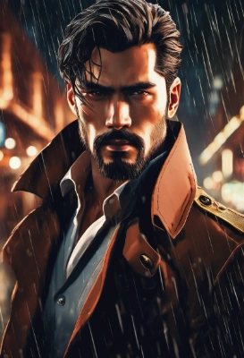 (best quality,8K, textile shading, upper body, anime, illustration, close up, dynamic lighting, dynamic angle),(ultra detailed face), (solo:1.2), (1man, Japanese famous actor, handsome, exuding dandy yet rugged charm, dandy:1.2), (chiseled features, strong jawline, high cheekbones, well-groomed beard, piercing eyes, one covered by an eyepatch), (hiding against a brick wall in a gritty, rain-soaked city at night),(standing against the wall:1.2), (looking at the building in the back:1.2), (detective), (eyepatch), (stylish long coat and holding a cigarette, intelligent, stylish),(piercing gaze is directed towards a distant building), precise detailed, dramatic, cinematic, highly detailed background, elaborately designed clothes, (cinema scene, atmosphere filled with the essence of a classic noir),