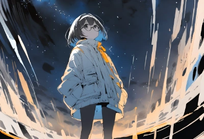 (((brilliant steampunk theme))), (((roughly drawn watercolor))), sketch, masterpiece, best quality, extremely detailed, anime, ((starry night)), girl, solo, bobcut, black hair, black eyes, round eyes,18yo, (((wearing Eye Patch))), wearing glasses, hairbands, upper body, ((looking up at the sky)), looking away, City , from below, fisheye, full length portrait, ((dutch angle)), <lora:flat2:-1> <lora:saturation:-0.8> , ,
