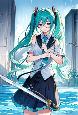 masterpiece, best quality, extremely detailed, anim1girl, hatsune miku, vocaloid, masterpiece, best quality, rating: general, newest,pirates,blue eyes,blue hair,green hair,twintail,longhair,wet hair,Eye Patch,fantasy,sea,rain,sworde, girl, skirt1girl, hatsune miku, vocaloid, masterpiece, masterpiece, best quality, extremely detailed, anime, full body shot, a middle-aged man, pirate captain, maccho, medium hair, red , curly hair, small braid on left temple, wearing a black pirate hat, (pirate eyepatch on the left), beard, mustache, evil smile, grin, smug face, black captain coat, long coat, beige medieval tunic, (black pumpkin pants), leather boots, holding a saber in the right hand, holding a musket pistol in the left hand, , caribbean, sea, medieval sailing ship, on ship deck, midde ages, Age of Discovery ,twintail,longhair,blue hair,green hair,blue eyes,Eye Patch,Stars,fantasy,sword