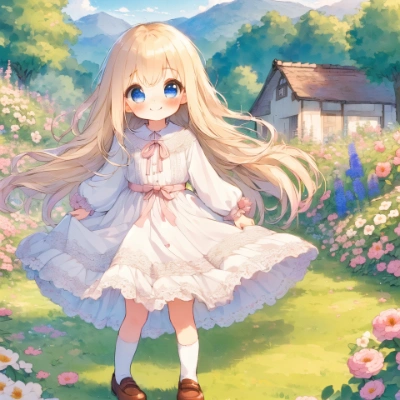 1girl ((little female child)) loli toddler preschooler two side up (very long) blonde hair flower pink gown princess pink long dress luxury dress decorations (frills) lace-trimmed embroidery long sleeves pink shoes ribbon blush smile closed mouth long sleeves looking at viewer [blue eyes] standing on grass floral garden masterpiece best quality