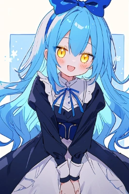 yellow eyes, blue hair,girl,glowing eyes,cute, Girlish,inner hair,evil smile,smug,A girl in a futuristic cyberpunk style, complex patterns, heavy metal theme, glowing energy lines, faceless, glowing eyes, elegant and intense, red and black uniform, alone in a modern urban city street with dark clouds and thunderstorm, dramatic lighting, (masterpiece:1.2), best quality, high resolution, beautiful details, extremely detailed, perfect lighting