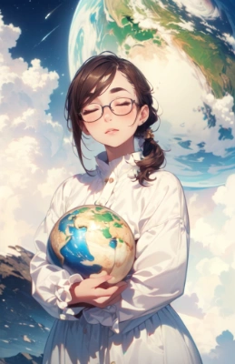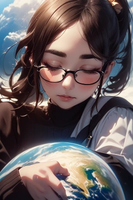 glasses, thick eyebrows, short eyebrows, droopy eyes, yellow eyes, blueish silver hair, twintails, ruri, Twin tails tied with red hair clips,