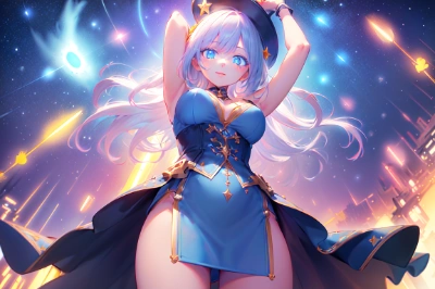 masterpiece, best quality, highly detailed CG unity 8k, illustration, Anime style, complicated, (perfect anatomy), extremely detailed 1 girl, (har face focus:1.4), (full body), looking at front, shoot from below, contrapposto, extremely detailed face, dignified face, smile, (kawaii:1.2), detailed eyes, (blue eyes:1.2), (twinkle in the eyes), silver hair, delicate hair, straight hair, shiny hair, clavicle, large breasts, (High Socks:1.2), red ribbontie, off-the-shoulder, slender body, slender legs, perfect fingers, nice hand, holding a Cane with star design, cast a spell, highheel, light and shadow, under the starry sky, magic of meteor shower, beautiful digital artwork, exquisite character art, <lora:flat2:0.3> <lora:hairdetailer:1> <lora:saturation:0.7> <lora:yawanuri:1> <lora:brighter-eye1:0.5> ,