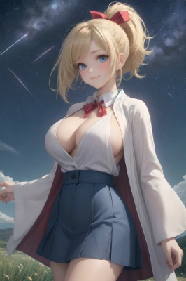masterpiece,8k anime,best quality,perfect anatomical body,1 girl,solo,((blonde,short hair,ponytail,long sideburns,parted bangs,hair accessory,red ribbon)),blue eyes,beautiful female face,smiling,cowboy shot,hair blowing in the wind,big boobs:1.4,(purple robe,big,red trim),beautiful cleavage,smooth stomach,wide waist:1.8,big beautiful hips:1.8,(blue miniskirt,red trim line),dancing on a hill,gazing at the viewer,(night background,field,night,starry sky,big shooting star falling down),<lora: flat2:0.7> <lora :make25d_type3_v100:0.5>,,,