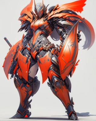 a dark blue robot with giant weapons sticking out of it\'s backside, A female knight robot flipping her cloak, a, robot, weapon, huge gun, huge shield, solo, gun, , Female Knight , standing , holding a gun , armour , blue armour, <lora:warframe_v1-000012:0.8>