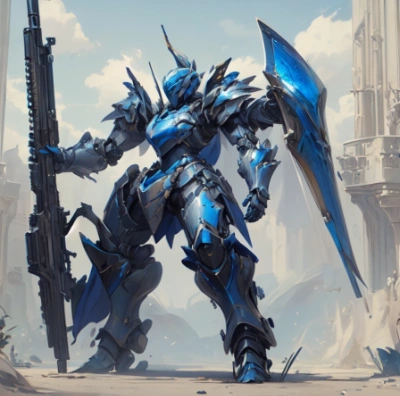 a dark blue robot with giant weapons sticking out of it's backside, A female knight robot flipping her cloak, a, robot, weapon, huge gun, huge shield, solo, gun, , Female Knight , standing , holding a gun , armour , blue armour, <lora:warframe_v1-000012:0.8>