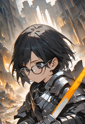 (brilliant fantasy theme), (very roughly drawn illustration), (((Low saturation painting))), masterpiece, best quality, extremely detailed, anime, one young knight lady, 18yo, ((solo)), tiny, bobcut, black hair, black eyes, small eyes, (wearing glasses), wearing metallic armor, holding asword, dynamic action, ruins, dutch angle, full length portrait, <lora:flat2:-1> <lora:saturation:-0.95>,,
