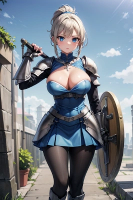 (photorealistic:1.4), (RAW photo), masterpiece, best quality, extremely detailed, lady, knight, neat and clean, (serious:0.8), blonde hair, ponytail, blue eyes, light blue rubber suit, light blue rubber tight skirt, (metallic silver breast plate, metallic silver visor:1.3), metallic silver boots, metallic silver gauntlet, black pantyhose, standing, having a sword, having a shield, cross mark,
