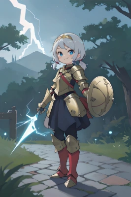Masterpiece, 8K anime, best quality, perfect anatomical body, 1 girl, solo, ((blonde, short hair, pigtails, long sideburns, parted bangs, hair accessory, red ribbon)), blue eyes, beautiful female face, smiling, cowboy shot, (armor, blue, heavy, with gold lightning decoration), big breasts: 1.4, (armor, blue), beautiful cleavage, smooth stomach, wide waist: 1.8, big beautiful hips: 1.8, (armor, heavy), (armor boots, heavy metal), standing on cobblestones, looking at the viewer, dungeon background, <lora :make25d_type3_v100:0.5>,, , <lora:flat2:0.85> <lora:hairdetailer:0.3> ,