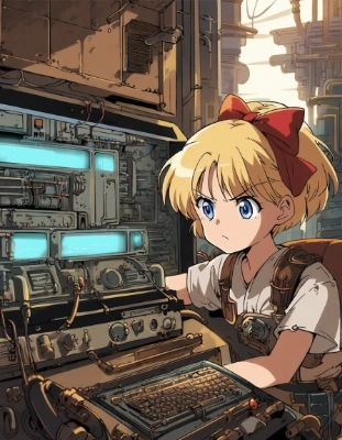 1 gril,blonde hair blue eyed girl with short hair and red bow programming on computer,hair bow,red bow,robot next to her moving based on her coding,messy room filled with computer parts,cables everywhere,afternoon lighting from window,highly detailed scene,digital painting,