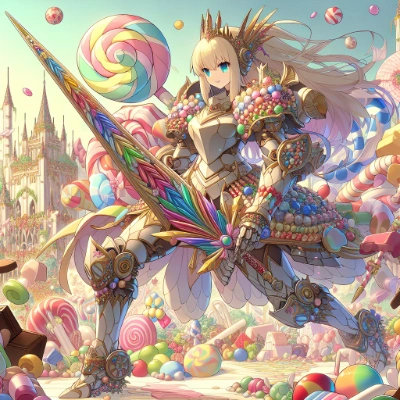 masterpiece, best quality, extremely detailed, anime, 1girl, cute, Big eyes, Night Saber, girl, candy kingdom, the girl@!@s armor is decorated with colorful candy, the sword is a big candy cane, a little mischievous, the background is a candy castle, candy trees, pastel colors, pop, colorful <lora:flat2:-1> <lora:hairdetailer:1> ,
