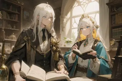 (chibi:1.4),masterpiece, (best quality:1.4),1boy,highly detailed beautiful face and eye, amber, white hair, Straight hair, french braid, beautiful hair, (sharp detail:1.1), chromatic aberration, lots of dust, pile of books, (alchemy:1.3), Wizard attire, dark color, piercing, (jewery:1.3),gorgeous, experiment, light smile, experiment,full body,looking away,