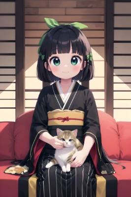 1 girl,(((very longest hair))),smile, Black hair,straight Hair,hair ribbon,mintgreen stripe,Black Eyes,flat chest,straight Across bangs,princess Cut, Very Long Sideburn,roundry Head,Droping eyes,cute,Meekness,Bob Cut,long back hair,12 years Old,loli,Sunset