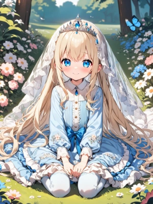 1girl ((little female child)) loli toddler preschooler (very long) blonde hair light blue gown princess light blue long dress luxury dress decorations (frills) lace-trimmed embroidery long sleeves tiara veil blush smile closed mouth long sleeves looking at viewer [blue eyes] wariza on grass floral garden masterpiece best quality