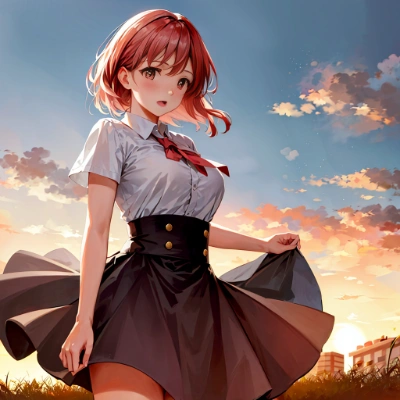 best quality, masterpiece,1woman, solo, turn off the light, stand light,setting sun, beautiful woman,35 years old,hdr,eyes,gleam pink medium hair ,(realistic:1.2),large breast,large eyes,round face,resigned look,magical milf,(outdoors, street), Magical girl , (wind:1.2), skirt tug,embarrassed,(panicking:1.0),open mouth, <lora:add_detail:0.3>