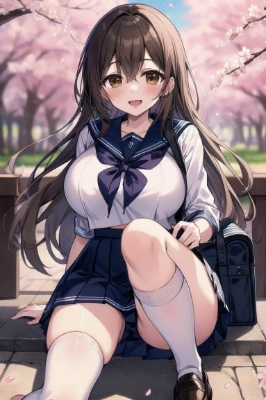 masterpiece, best quality, extremely detailed, anime, 1girl, solo, purple eyes, (((droopy eyes))), skirt, light brown hair, (((((swept bangs))))), smile, looking at viewer, long hair, dark blue blazer, Yellow vest, white shirt, blue ribbon tie, chair, black pantyhose, older sister, large breasts, back hair tied the neck,,,
