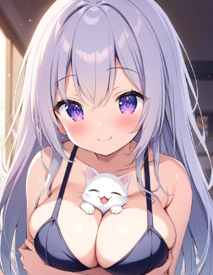 (hugging little white kitty, laughing with closed eyes:1.2), lying, on back, on bed, girly roomwear, bare thigh, (soft lighting, pastel tone, girly mood:0.8), love, happy,