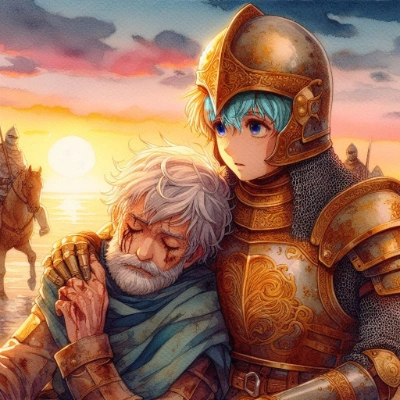 best quality, watercolor anime,one medieval Persian knight, 30 years old, hair color is black, (short pulled back hair),handsome,tsurime,tanned skin,(((long-shaped face))),robust build, (((broad shoulders,))) wearing black armor, (Black cape with a red lining).(smile open mouth), carrying one Persian (new born kitten) on his right shoulder, BREAK,(the Persian kitten is very small:1.8),(((Pure white))) ,pretty,eyes are blue.kirakira, , Wearing a small tiara on its head,joyful