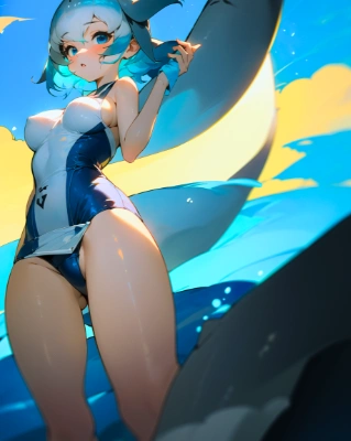 1girl, stellers_sea_cow, girl, long hair, breasts, blue eyes, large breasts, gloves, navel, jewelry, very long hair, blue hair, swimsuit, bikini, multicolored hair, grey hair, elbow gloves, bracelet, groin, blue bikini, frilled bikini, cetacean tail, newest, very aesthetic, absurdres, (masterpiece), best quality, (beautiful face), beautiful, ultra detail, high quality, top quality, 8k, rating: general, newest, illustration,extremely detailed, anime style, aesthetic style, <lora:stellers_sea_cow:1>