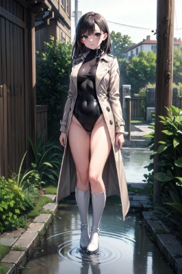 (photorealistic:1.4), (RAW photo), masterpiece, best quality, extremely detailed, lady, translucent trench coat, knee length rubber boots, enamel leotard, neat and clean, long hair, smile, stand in puddle,