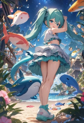 masterpiece, best quality, extremely detailed, anime, girl, skirtmasterpiece, best quality, extremely detailed, anime, girl, skirt1girl, hatsune miku, vocaloid, masterpiece, best quality, rating: general, newest,pirates,twintail,longhair,wet hair,Eye Patch,famasterpiece, best quality, extremely detailed, anime, girl, skirtmasterpiece, best quality, extremely detailed, anime, girl, masterpiece, best quality, extremely detailed, anime, girl, skirtmasterpiece, best quality, extremely detailed, anime, girl, 1girl, hatsune miku, vocaloid,Anime illustration: Set against the expansive blue of the coral reef cave, a high girl with a high is swimming. Her black and white metallic bikini, adorned with a floral pattern and frills, stands out. Bubbles and the dance of light refractions enrich the scene.,longhair,tail,Witch,al girl,whale,Princess,Twintails,mini skirt,fantasy,masterpiece, best quality, extremely detailed, anime, girl, skirt1girl, hatsune miku, vocaloid, masterpiece, best quality, extremely detailed, anime, girl, skirtmasterpiece, best quality, extremely detailed, anime, girl, skirt(hatsune miku:1.1)(1girl,solo,loli:1.2), (masterpiece:1.3),(best quality:1.3), white Clothes,frilled bikini, bikini skirt, an extremely delie and beautiful,smile,(arms up:0.5),ry , at ,Side Tail,fantasy,longhair,mini skirt,Twintails,Rubber,blue ,clear ,twintail,Crystal Clear Sea,Footprints,Short Stature,Stars,night,flower,ry sky,sea,ntasy,sea,sky,Caramel,butterfly,beach,beach at night,cherry blossom,blue hair,green hair,blue eyes,colorful,starry sky,cafe