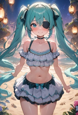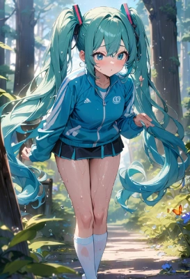masterpiece, best quality, extremely detailed, anime, girl, skirt1girl, hatsune miku, vocaloid, masterpiece, best quality, rating: general, newest,mini skirt,tracksuit,blue hair,green hair,twintail,longhair,wet hair,blue eyes,Jersey,high socks,colorful,fantasy,school,blue sky,summer,zettai ryouiki,flower,forest,butterfly