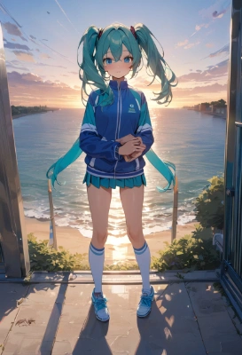 masterpiece, best quality, extremely detailed, anime, girl, skirt1girl, hatsune miku, vocaloid, masterpiece, best quality, rating: general, newest,mini skirt,tracksuit,blue hair,green hair,twintail,longhair,wet hair,blue eyes,Jersey,high socks,colorful,fantasy,blue sky,summer,zettai ryouiki,flower,forest,butterfly