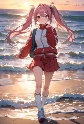 masterpiece, best quality, extremely detailed, anime, girl, skirt1girl, hatsune miku, vocaloid, masterpiece, best quality, rating: general, newest,mini skirt,tracksuit,blue hair,green hair,twintail,longhair,blue eyes,Jersey,high socks,colorful,summer,zettai ryouiki,school,schoolgirl,blue ,park,sea,sunset,evening sun
