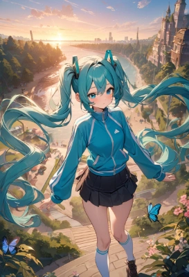 masterpiece, best quality, extremely detailed, anime, girl, skirt1girl, hatsune miku, vocaloid, masterpiece, best quality, rating: general, newest,mini skirt,tracksuit,twintail,longhair,Jersey,high socks,colorful,summer,school,blue ,park,sea,sunset,evening sun , <lora:bigeye:1> <lora:gloweyes_v100:1>,beach,blue eyes,blue hair,green hair,fantasy,flower,butterfly,forest,city,schoolgirl