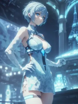 (blurry background:1.3), (extremely detailed fine touch:1.3), (hard light, studio light, light rays, dappled light, reflection, shadows, ray tracing:1.0), ///, blue blonde (super very short hair:1.3), (white simple dress), (cyber town:1.3), (neon:1.3), Future city, (innovative design:1.3), (motherboard:1.3), (zentangle:1.3), (art nouveau:1.3), (nice view:1.3), (deep space:1.3), (Glowing tower visible in the distance:1.3)
